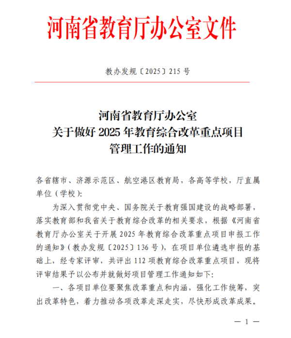 近日,河南省教育厅办公室下发了《关于做好2025年教育综合改革重点项目管理工作的通知》(教办发规〔2025〕215号),我校申报的《基于发展目标和价值导向的民办高校薪酬绩效体系改革实践》成功获批2025年河南省教育综合改革重点项目。
