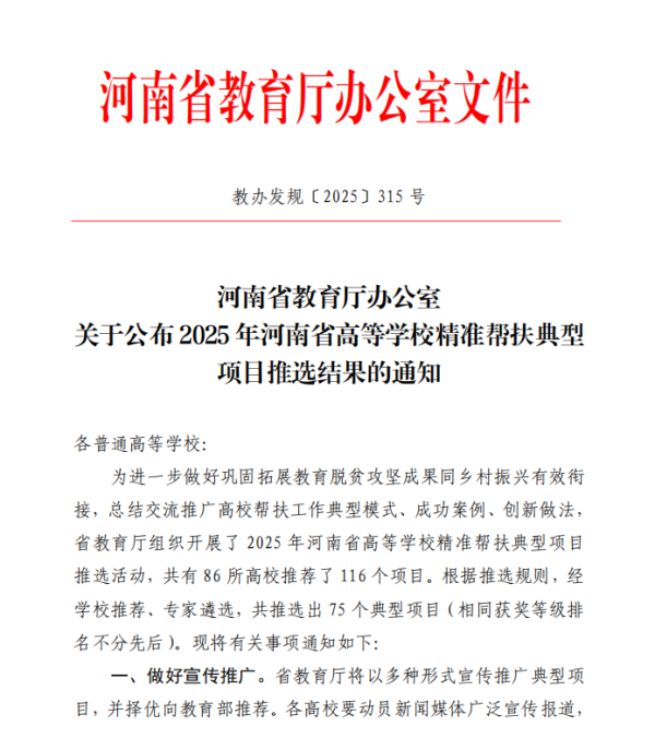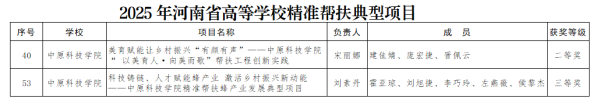 近日,河南省2025年高等学校精准帮扶典型项目获奖结果公布。根据《河南省教育厅办公室关于开展2025年河南省高等学校精准帮扶典型项目推选活动的通知》要求,全省共有86所高校推荐了116个项目。根据推选规则,经学校推荐、专家遴选,共推选出75个典型项目。我校宋丽娜老师的《美育赋能让乡村振兴“有颜有声”—中原科技学院“以美育人 · 向美而歌”帮扶工程创新实践》荣获二等奖;刘素丹老师的《科技铸链、人才赋能蜂产业,激活乡村振兴新动能—中原科技学院精准帮扶蜂产业发展典型项目》荣获三等奖。是河南省民办高校在此项目中获得的最好成绩。